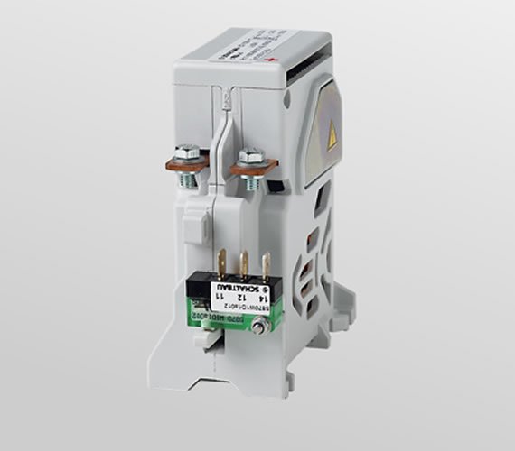 The single-pole NO contactor C193 can switch on and carry high currents. It was designed for switching loads frequently. The C193 is available as an AC or DC contactor. The DC versions are fitted with blowout magnets. The C193A and C193B designs possess electric arc arcing chambers for DC and AC. The magnetic drive can activated using voltages of 24 to 110 V DC. A snap-action switch reports the switch state of the main contacts to the higher-level control system.